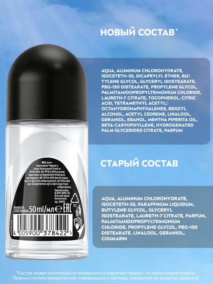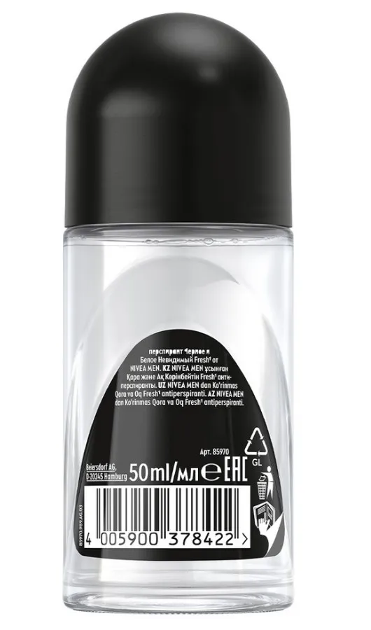 Шариковый дезодорант-антиперспирант Черное и Белое Невидимый Fresh' от NIVEA MEN со свежим мужественным ароматом не оставляет белых следов на черной одежде и предотвращает появление желтых пятен на белой одежде. Черная одежда остается черной, а белая одежда дольше остается белой. Уникальная в ассортименте бренда формула имеет 5 факторов защиты от: запаха, пота, пятен, следов и раздражения. Защищает кожу подмышек от неприятного запаха в течение 72 часов*. Не содержит этилового спирта. Дерматологически протестировано. Экономичный расход: шариковый антиперспирант даёт в 2 раза больше применений, чем спрей!**