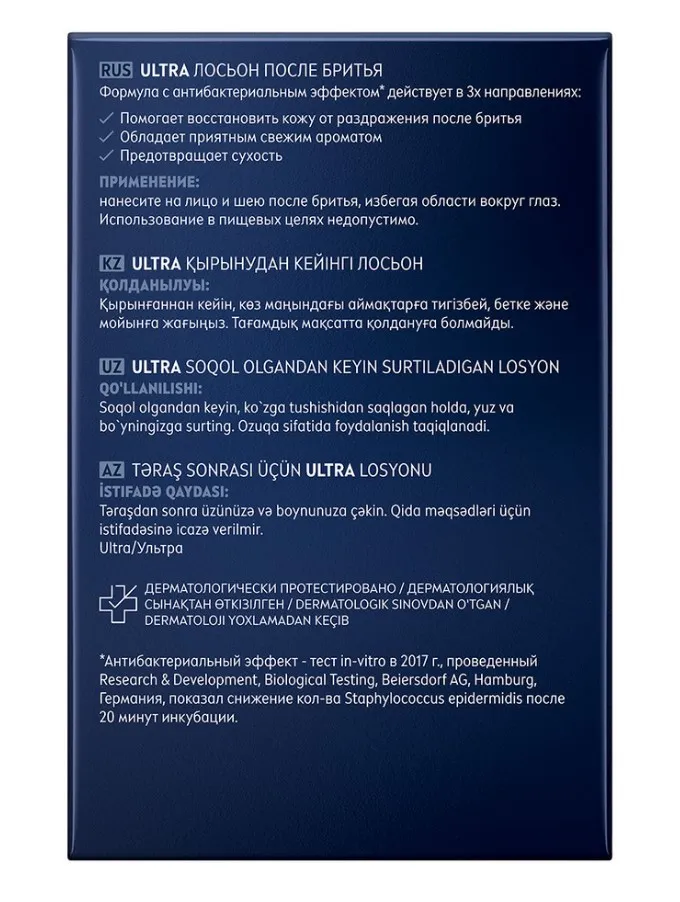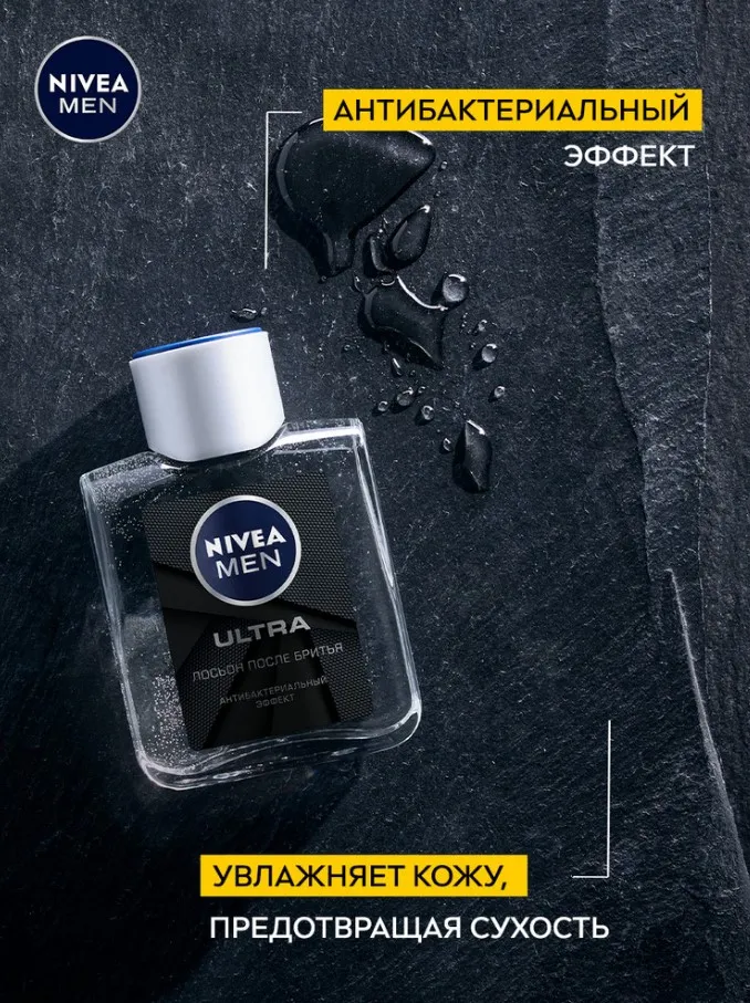Попробуйте лосьон после бритья ULTRA с антибактериальным эффектом от NIVEA MEN для всех типов кожи. Линейка ULTRA представлена в стильном черном цвете. Формула лосьона после бритья с антибактериальным эффектом действует в трех направлениях: помогает восстановить кожу от раздражения после бритья, обладает приятным свежим древесным ароматом для мужчин, предотвращает сухость кожи. Дерматологически протестировано. Рекомендуется использовать совместно с пеной или гелем для бритья из линейки ULTRA от NIVEA MEN.