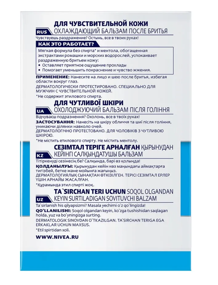 Чувствуешь раздражение? Остынь, все в твоих руках! Попробуй охлаждающий бальзам после бритья для чувствительной кожи от NIVEA MEN. Мягкая формула без спирта* и ментола, обогащенная экстрактами ромашки и морских водорослей, успокаивает раздраженную бритьем кожу: оставляет приятное ощущение прохлады, помогает уменьшить покраснение и чувство жжения. Дерматологически протестировано. Специально для мужчин с чувствительной кожей. Рекомендуется использовать совместно с пеной или гелем для бритья из охлаждающей линейки для чувствительной кожи от NIVEA MEN с эффектом прохлады.