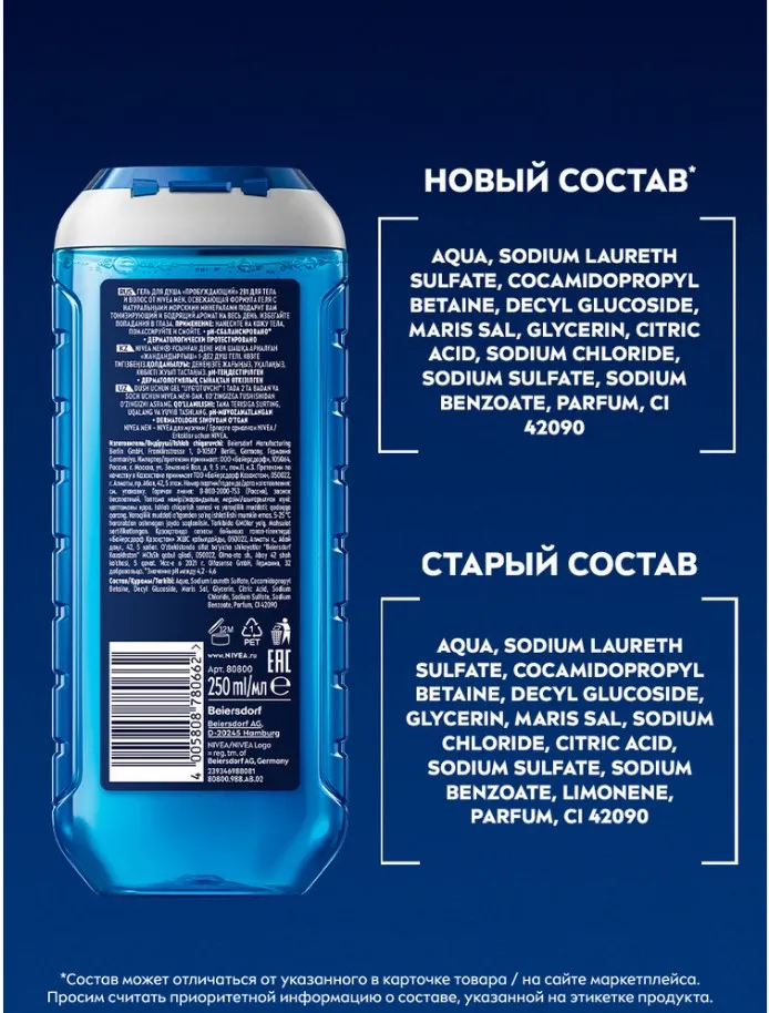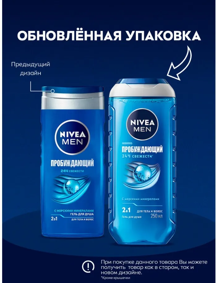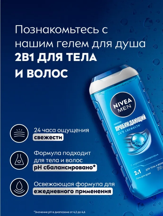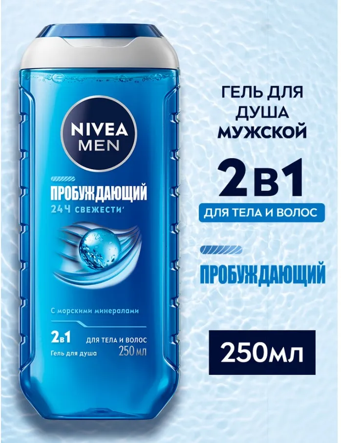 Встречайте гель для душа «Пробуждающий» 2в1 для тела и волос от NIVEA MEN в обновленном дизайне! Формула геля с натуральными морскими минералами в составе подарит ощущение свежести на 24 часа' и тонизирующий аромат. Получите заряд свежести и уверенности, наполняющий энергией для новых побед. Подходит для ежедневного использования. pH-сбалансировано''. Дерматологически протестировано. На 99% биоразлагаемая формула'''. Упаковка геля содержит 96 % переработанных материалов в составе*. Не содержит микропластик.