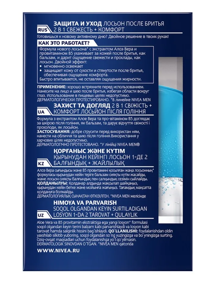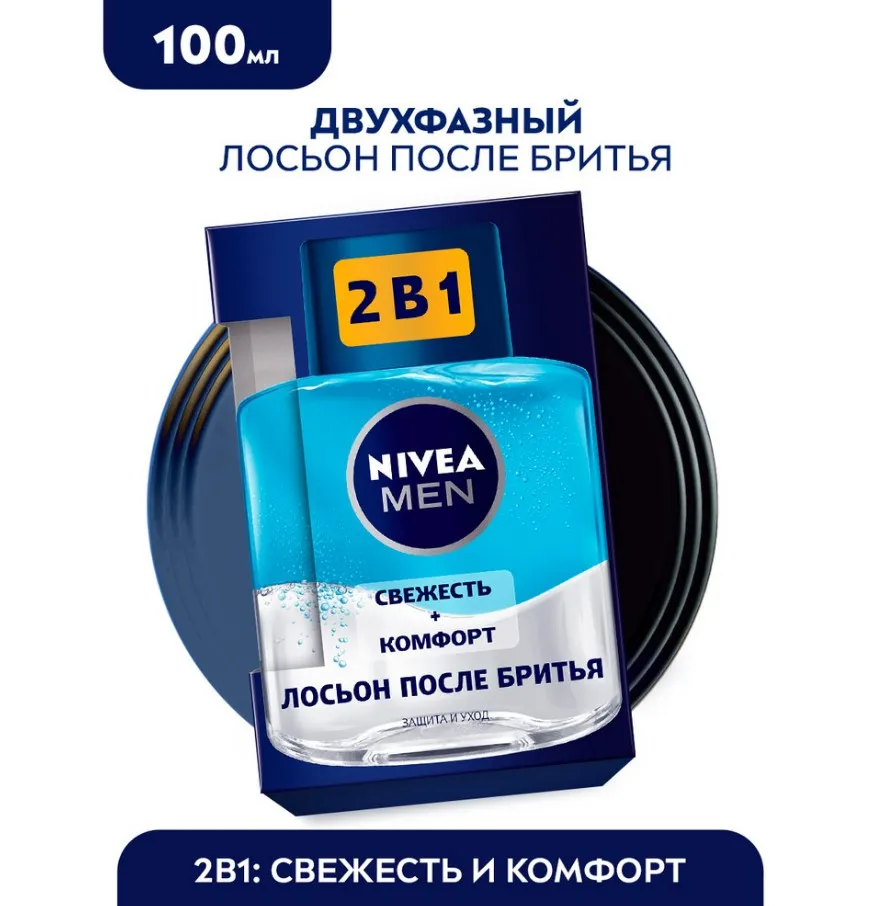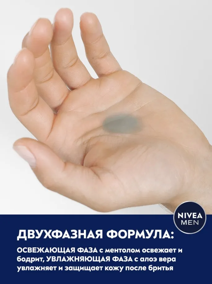 Готовишься к новому активному дню? Двойное решение в твоих руках! Попробуй лосьон после бритья «Защита и уход: 2в1 Свежесть + комфорт» для всех типов кожи от NIVEA MEN. Формула лосьона с экстрактом Алоэ Вера и Про-витамином B5 ухаживает за кожей после бритья, как бальзам, и дарит ощущение свежести и прохлады, как лосьон. Двойной эффект: мгновенно освежает, защищает кожу от сухости и стянутости после бритья, обеспечивая ощущение комфорта. Быстро впитывается, не оставляя ощущения жирности. Дерматологически протестировано. Рекомендуется использовать совместно с пеной или гелем для бритья из увлажняющей линейки «Защита и уход» NIVEA MEN для защиты от сухости кожи.