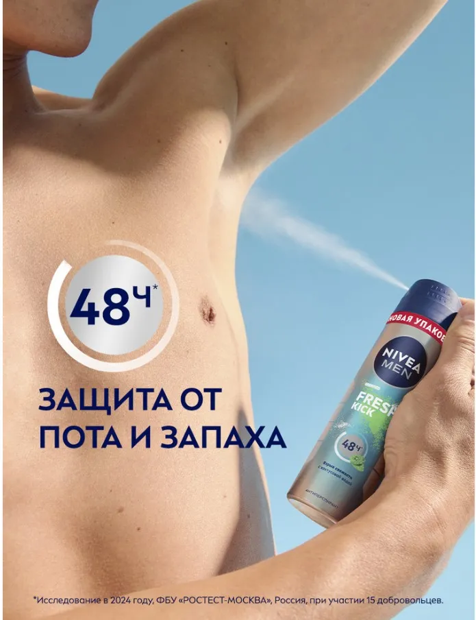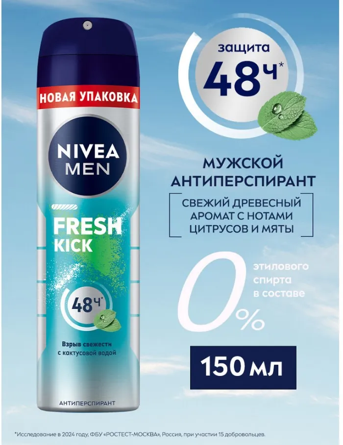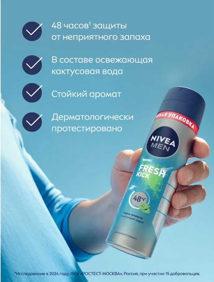 Ощутите взрыв свежести вместе с дезодорантом-антиперспирантом для мужчин Fresh Kick от NIVEA MEN с кактусовой водой в стильном дизайне в формате спрея. Дезодорант-антиперспирант спрей подарит вам чувство бодрящей свежести, приятный аромат и надежную защиту от пота и неприятного запаха на протяжении 48 часов*. Необычным компонентом нового антиперспиранта является кактусовая вода, которая вместе с другими ингредиентами дает ощущение свежести от NIVEA MEN Fresh Kick как после душа в жаркий день! Защитите себя от пота, забудьте о неприятном запахе, вместо этого почувствуйте чистоту после каждого применения. Будь естественно свеж вместе с NIVEA MEN Fresh Kick! Дерматологически протестировано.