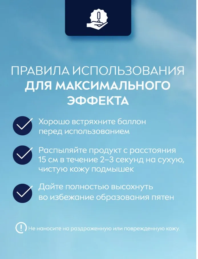 Способ применения: хорошо встряхнуть перед использованием. Распылять в области подмышек на чистую и сухую кожу с расстояния 15 см. Дать полностью высохнуть во избежание образования пятен на одежде. Не наносить на поврежденную или раздраженную кожу.