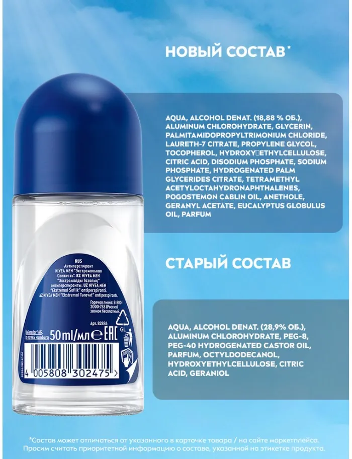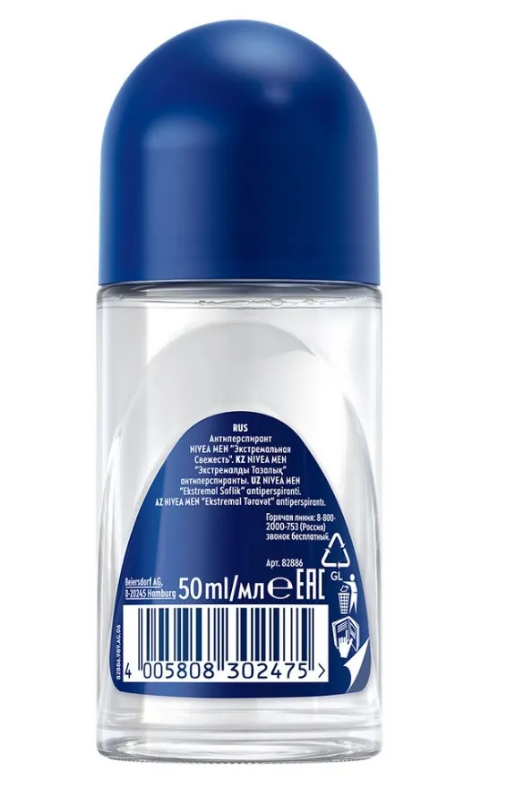 Роликовый дезодорант-антиперспирант NIVEA MEN Экстремальная свежесть с охлаждающим эффектом обеспечит вас надежной и эффективной защитой от пота и неприятного запаха на протяжении 72 часов*. Ощущение сухой и чистой кожи и заряд свежести в течение всего дня. В составе содержится масло авокадо, которое уникально тем, что его состав максимально приближен к жирам человеческой кожи для бережного ухода за кожей подмышек. Экономичный расход, шариковый дезодорант-антиперспирант удобно брать с собой. Продукт дерматологически протестирован. Не содержит этилового спирта.