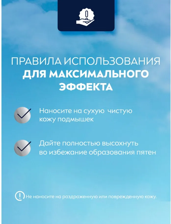 Способ применения: нанести на чистую и сухую область подмышек. Дать полностью высохнуть во избежание образования пятен на одежде. Не наносить на поврежденную или раздраженную кожу.