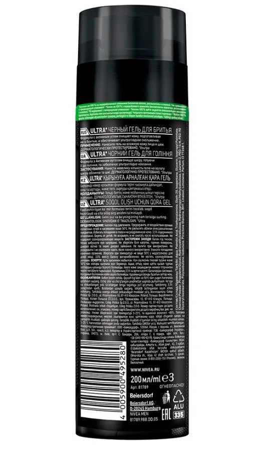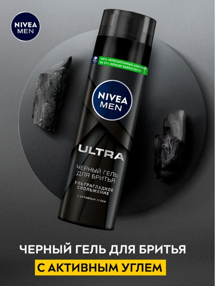 Попробуйте черный гель для бритья ULTRA с активным углем для всех типов кожи от NIVEA MEN. Формула с активным углем очищает кожу, подготавливая ее к бритью, и обеспечивает ультрагладкое скольжение. Черный гель для бритья обладает мужественным свежим древесным ароматом. При нанесении становится серым. Дерматологически протестировано. Рекомендуется дополнить уход, используя лосьон после бритья с антибактериальным эффектом из линейки ULTRA от NIVEA MEN для всех типов кожи.