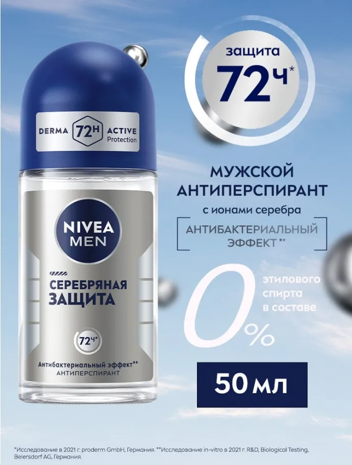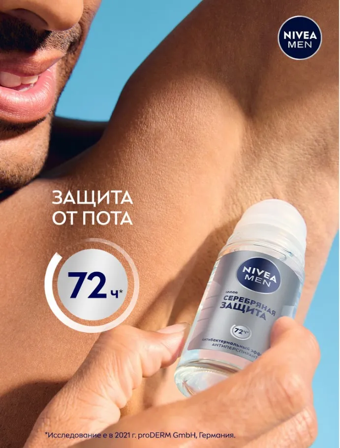 После душа или ванной тебе хочется ощущать комфорт и свежесть в течение дня. Попробуй шариковый дезодорант-антиперспирант NIVEA MEN Серебряная защита c антибактериальным эффектом** ионов серебра. Защита 99,9%* с ионами серебра. Ионы серебра, входящие в состав эффективной формулы дезодоранта, обладают антибактериальным эффектом.** Это значит, что ты защищен от пота в течение 72 часов*. Свежий древесный мужской аромат спрея останется с тобой на весь день. Дерматологически протестировано. Экономичный расход: шариковый антиперспирант даёт в 2 раза больше применений, чем спрей!***