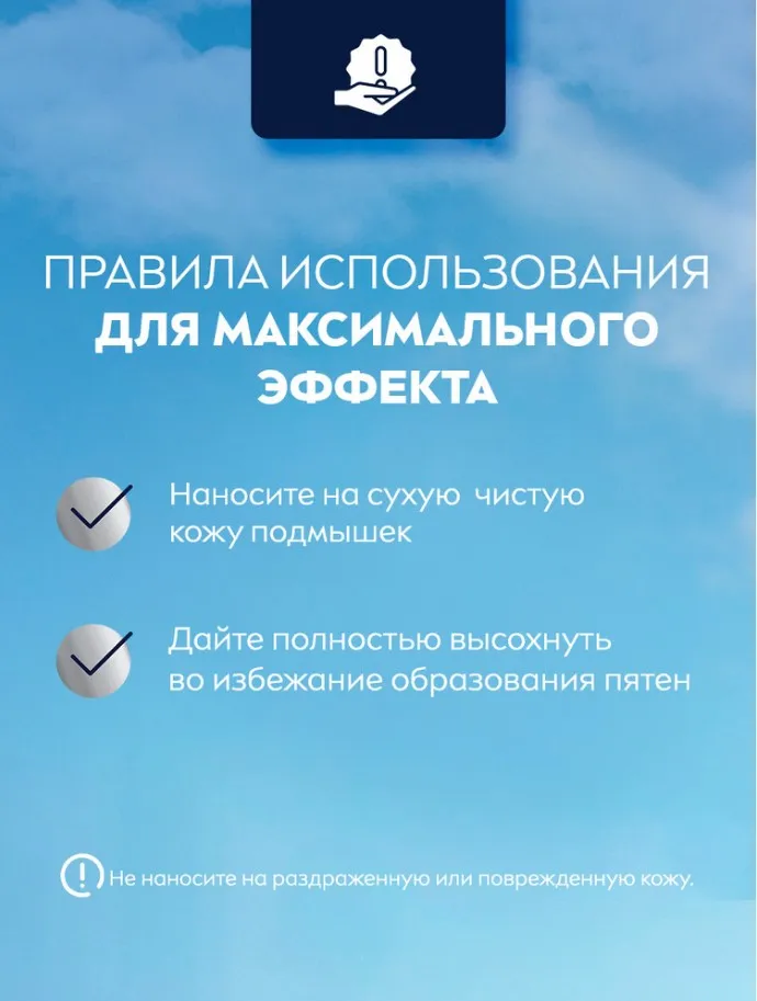 Способ применение: нанести на чистую сухую область подмышек. Дать полностью высохнуть во избежание образования пятен на одежде. Не наносить на поврежденную или раздраженную кожу. Использование в пищевых целях недопустимо.