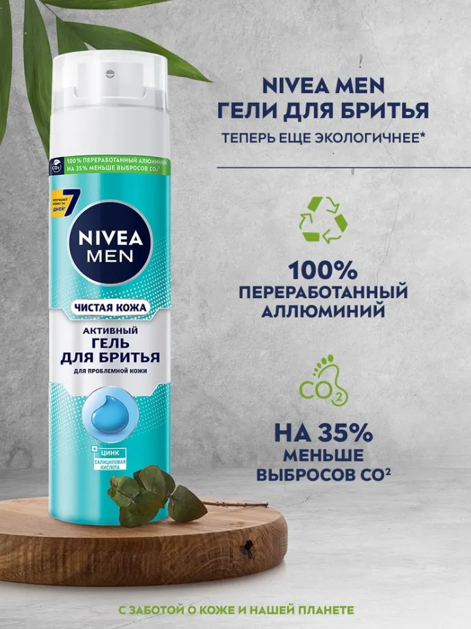 Попробуйте активный гель для бритья «Чистая кожа» от NIVEA MEN для чувствительной и проблемной кожи. Активный гель для бритья обеспечивает супергладкое бритье, защищает кожу от раздражения и улучшает кожу за 7 дней*. Результат – чистая кожа! Гель для бритья обеспечивает супергладкое скольжение бритвы и защищает кожу от порезов. Формула с цинком и салициловой кислотой уже во время бритья успокаивает раздраженную кожу и способствует устранению прыщей**. Дерматологически протестировано. Рекомендуется дополнить уход, используя лосьон после бритья из линейки «Чистая кожа» от NIVEA MEN.
