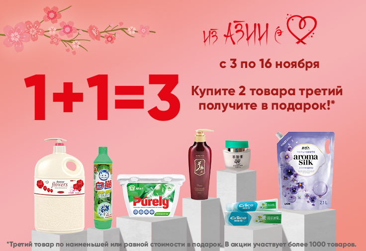 Более 1000 товаров от любимых азиатских брендов: уходовая косметика, средства личной гигиены и бытовая химия —в акции «1+1=3»